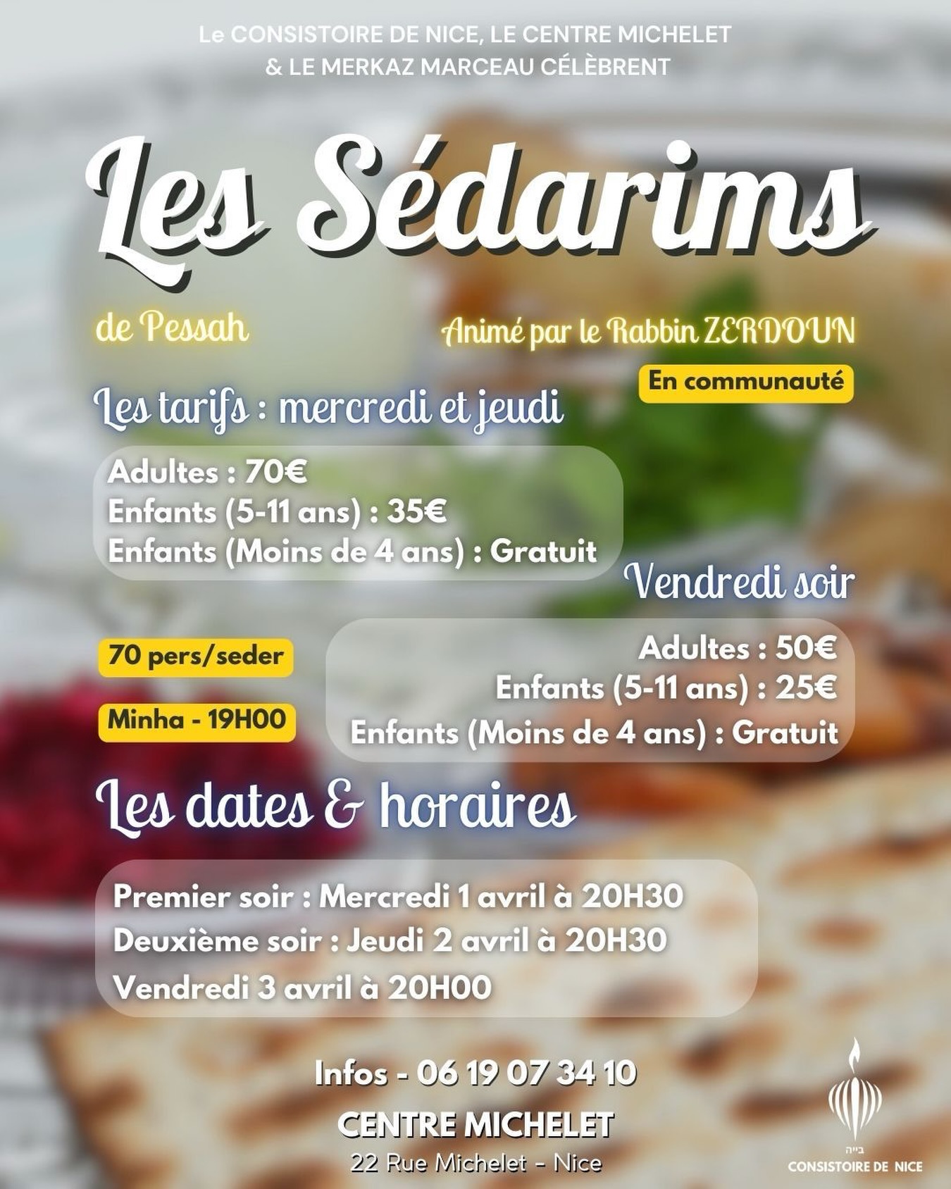 Tous les organismes sociaux et communautaires doivent se mobiliser pour se soucier des besoins des plus démunis, en offrant le nécessaire de la fête, ceci fait partie des lois dela fête de Pessa’h. Aussi le Consistoire de Nice encourage toutes initiatives allant dans ce sens, indépendamment de son propre engagement dans ce domaine.